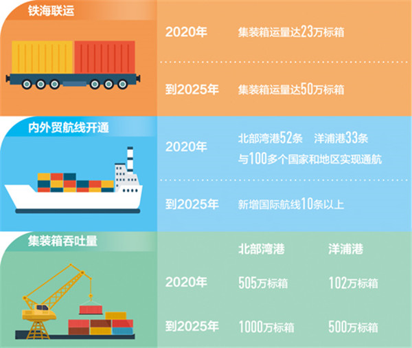 港航能力将显著增强。到2025年,北部湾国际门户港、洋浦区域国际集装箱枢纽港设施功能、服务配套全面完善。国内国际航线网络进一步加密,新增国际航线10条以上。北部湾港、洋浦港集装箱吞吐量分别达到1000万、500万标箱,其中外贸箱吞吐量分别达到200万、100万标箱。